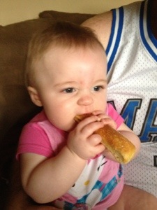 Tonight, you noshed on a breadstick. I gave it to you against my better judgment, but it turned out to be pretty hilarious and I am glad that you enjoyed yourself. You know, I WAS glad, until I had to clean you up. And you were covered in buttery garlic mess. That was not so much fun. And I just found some of this mess behind my ear. So, there’s also that.