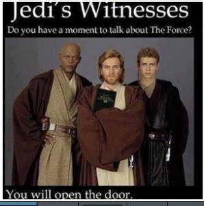 Several times a week, after I have spent an hour trying to get Baby L ready for a nap and then waiting for her to fight sleep and finally give in so I can go and EAT A DAMN SANDWICH, I walk back into the living room, take a bite of said sandwich and notice, out my front window, people walking up to my front door. (It is important that you know, internet, that we don’t use our front door. It is locked at all times, and can only be opened (even from the inside) with a key. Because we use the carport door. Because that makes sense. You know, because we park there. All of our friends use the carport. Everyone uses the fucking carport.) It happens before noon. And, because I have to, then, frantically search for my keys in order to unlock the door, these people typically have time to ring the doorbell and within ONE SECOND of doing so, add in a good banging on the front door. You know, for good measure. And then Baby L is screaming. And there is a rotund black woman wearing a giant hat, and a tall gentleman wearing a suit standing there, anxiously waiting to tell me where to find Jesus.